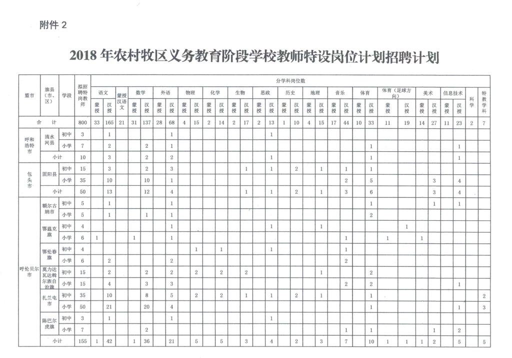 2.内蒙古自治区2018年农村牧区义务教育阶段学校教师特设岗位计划招聘计划