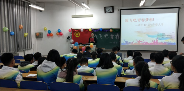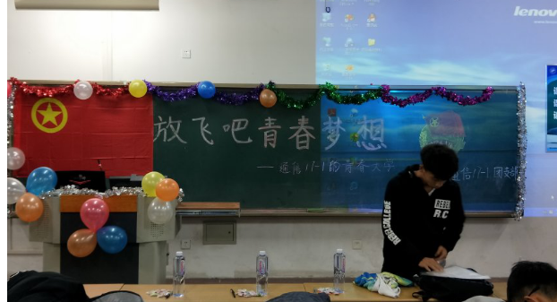 通信17-1团支部于2017年11月17日在教B207晚上7点举行第一学期第一次团日活动,此次团日活动主题是“放飞吧青春梦想--我的大学生活规划教育”,活动名称是“通信17-1的青春大学”。团日活动涉及到了歌曲、小品、演讲、游戏、视频、魔术。有个人表演,组合表演,以及观众参与表演,可以说是活动多样化,人员参与到位。展现了通信17-1青春有活力的样貌,让我们的大学生活变得更加精彩飞扬。