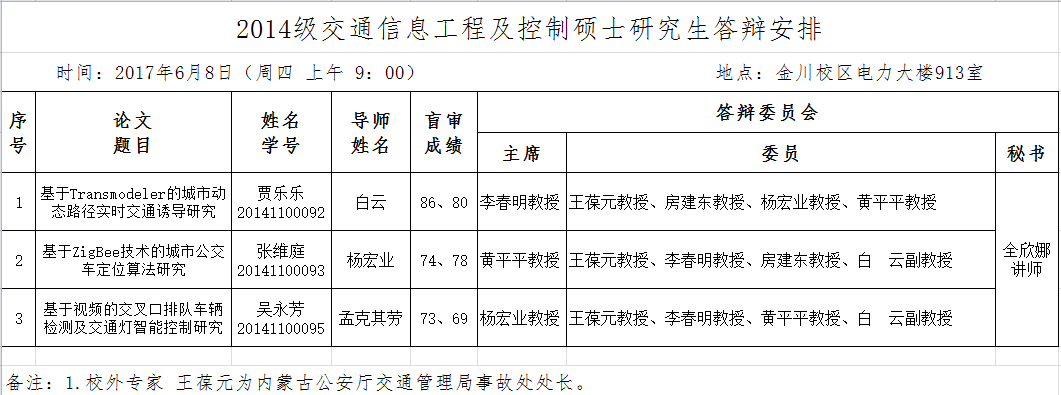 2017年6月交通信息工程及控制硕士学位论文答辩安排